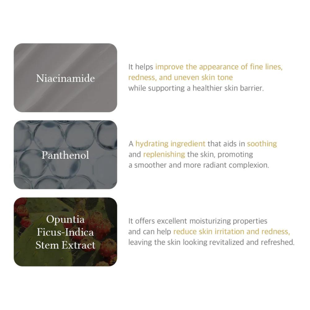 - Niacinamide, or Vitamin B3, - Enhances the skin's moisture barrier, regulates oil production, fades dark spots, and promotes an even skin tone.