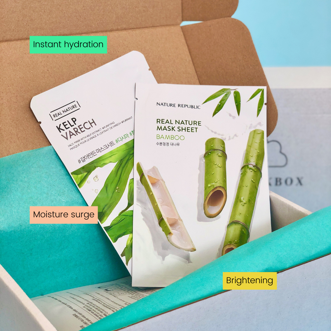 Each SHEET MASK BOX is filled with 8 KOREAN SHEET MASKS accustomed to your skin concern and story. P.S. We also pack extra small gifts into your box!